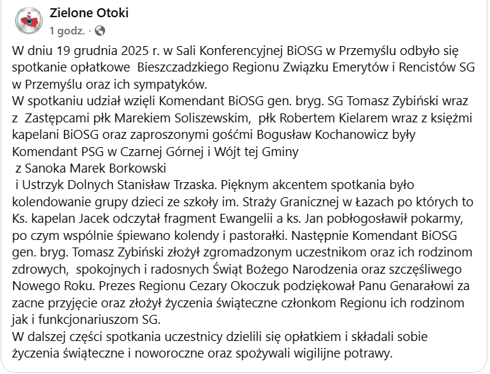 Poniżej zamieszczamy zrzut wpisu ze strony „Zielone Otoki” na Facebooku oraz galerię zdjęć ze spotkania. Gratulujemy pięknej uroczystości wszystkim uczestnikom i życzymy wszystkiego najlepszego z okazji świąt Bożego Narodzenia i zbliżającego się Nowego 2026 Roku!