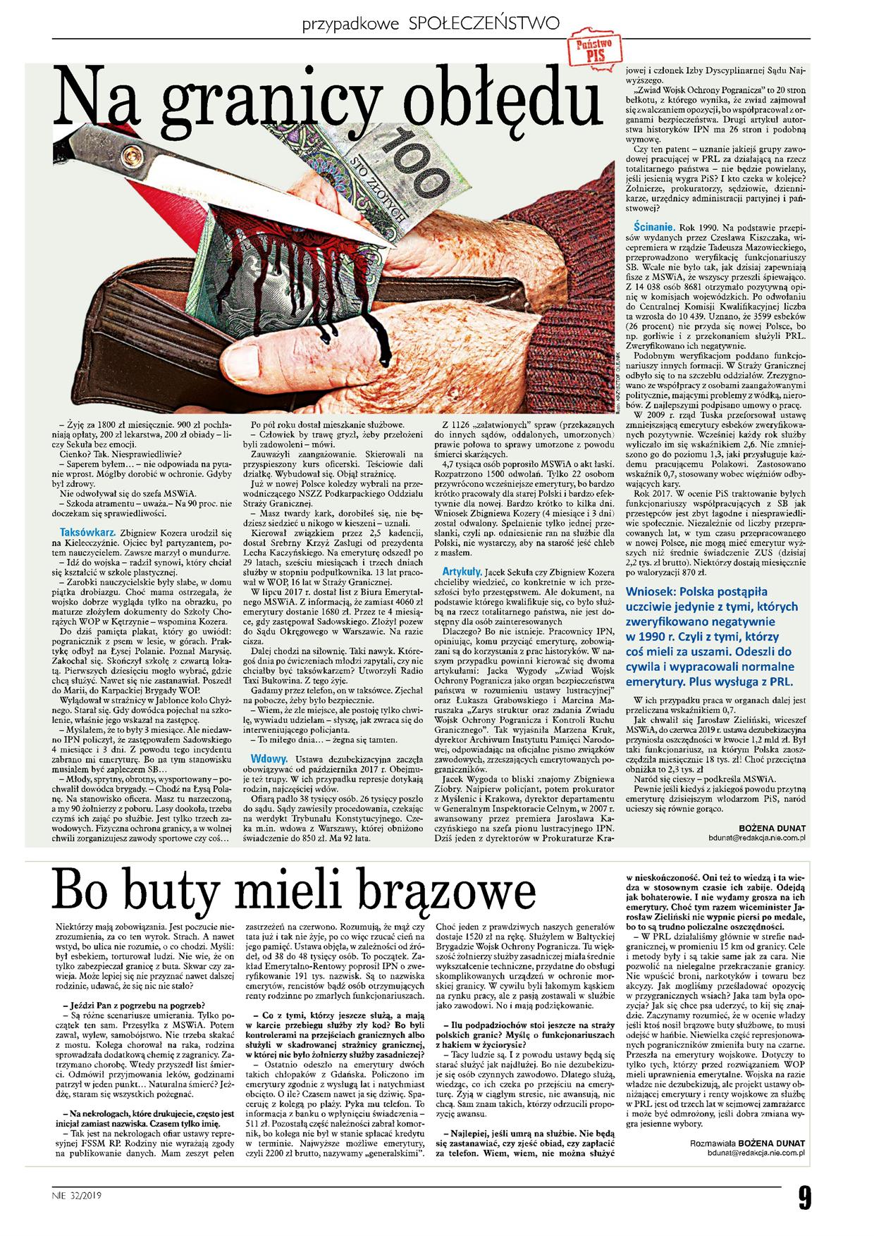 W ostatnim numerze tygodnika „Nie” jest artykuł o naszych Kolegach, którym z niewytłumaczalnych w normalny sposób przyczyn obniżono emerytury! Artykuł ten zamieszczamy niżej razem z krótkim wywiadem z Prezesem naszego Związku Kol. Markiem Meszyńskim pt. „Bo buty mieli brązowe”, na temat sytuacji represjonowanych w środowisku służb granicznych.
