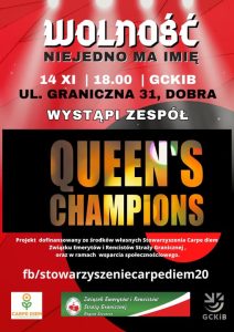 Stowarzyszenie Carpe Diem oraz Region Szczecin ZEiR SG organizuje w dniu 14 listopada szczególne wydarzenia. Będzie to koncert ,, Wolność niejedno ma imię”, zagra niezwykły zespół Queen’s Champions. Ale nie będzie to typowy koncert pieśni patriotycznych.