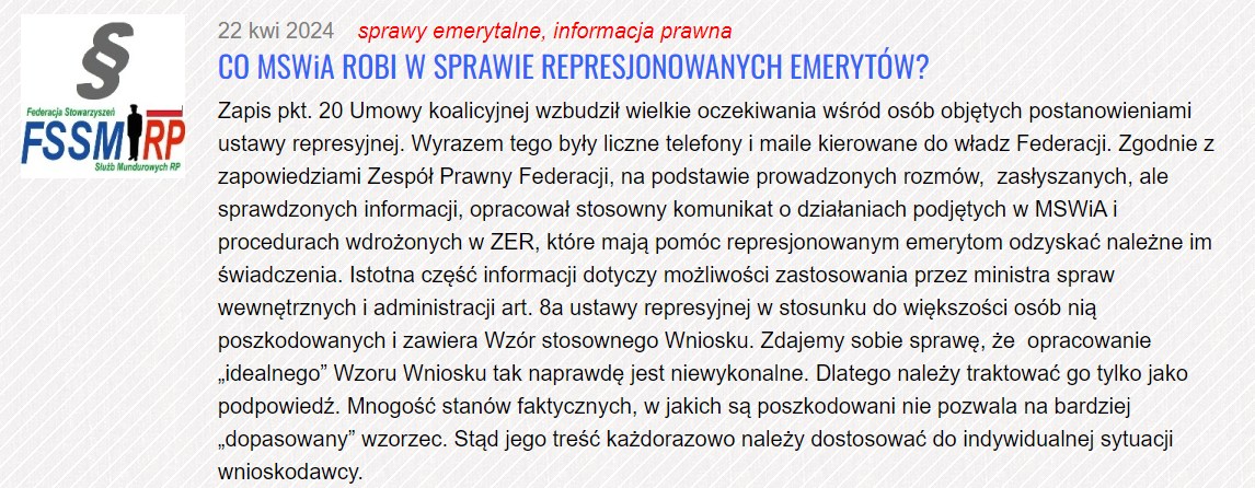 Nasze oczekiwania w zakresie sposobu i zakresu realizacji ww. umowy koalicyjnej zawarliśmy w wystąpieniu do Ministra Spraw Wewnętrznych i Administracji – Pana Marcina Kierwińskiego z dnia 8 lutego 2024 r. sygnowanego wspólnie przez Przewodniczącego Federacji Stowarzyszeń Służb Mundurowych – płk dypl. w st. spocz. Henryka Budzyńskiego oraz Wiceprezesa Stowarzyszenia Emerytów i Rencistów Policyjnych – insp. w st. spocz. Jerzego Skryckiego opublikowanego na stronie FSSM w dniu 12 lutego 2024 r. Przyznajemy jednak, że odpowiedź jaką otrzymaliśmy na ww. wystąpienie trudno uznać za konkretną i wychodzącą naprzeciw naszym precyzyjnie sformułowanym postulatom. Bardzo ogólna informacja o trwających w MSWiA „pracach analitycznych” oraz „analizach zagadnień prawnych i ekonomicznych związanych z funkcjonowaniem policyjnej ustawy emerytalnej” była mało satysfakcjonująca. Należy jednak zaznaczyć, że powyższa odpowiedź została przygotowana w poprzednim miesiącu, stąd nie objęła sekwencji zdarzeń (rozmów, konsultacji i decyzji), które nastąpiły później.