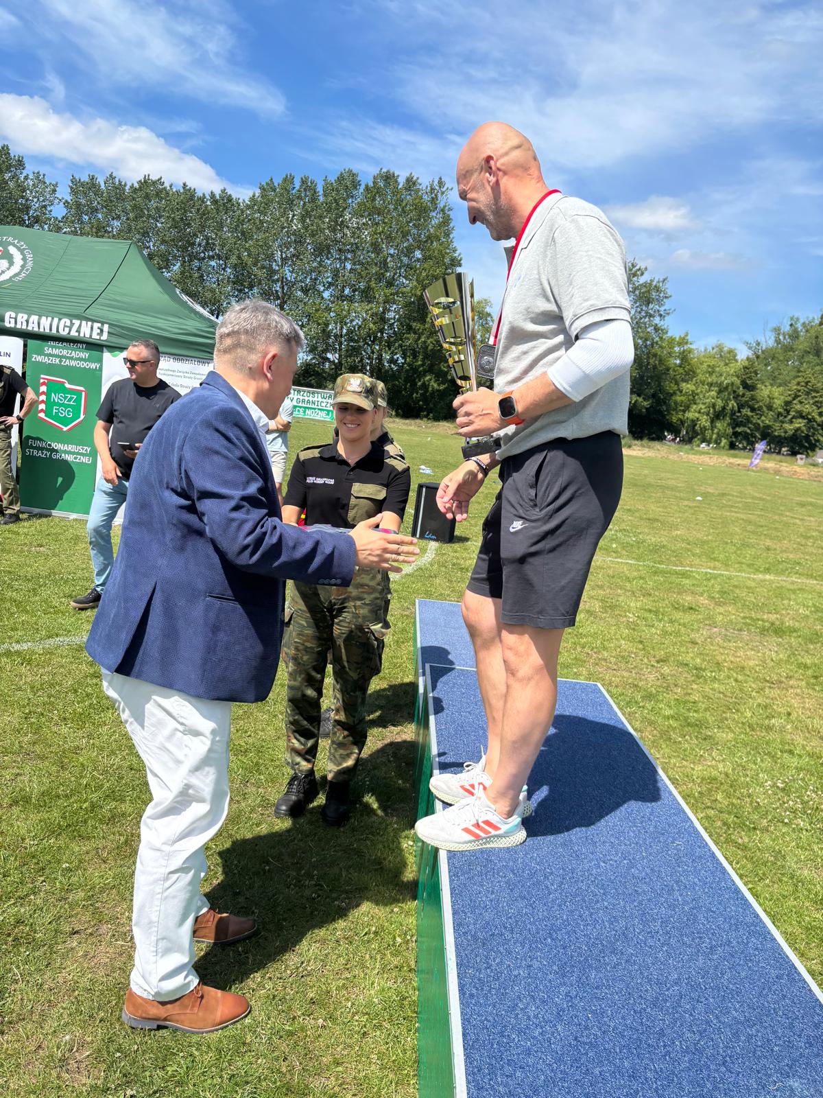 Koszalin – XVIII Mistrzostwa SG w piłce nożnej. Puchar od ZEiRSG dla nestora mistrzostw Bartłomieja Galanty.