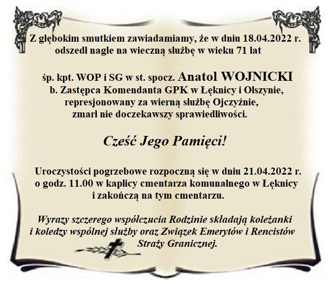 Odszedłeś nagle nie doczekawszy formalnego potwierdzenia członkostwa w Związku Emerytów i Rencistów Straży Granicznej – Region Nadodrzański, do którego zgłosiłeś akces. Faktycznie od dawna byłeś naszym Członkiem i Kolegą, aktywnie udzielając się, jako osoba o wykształceniu prawniczym, w działania pomocowe dla wszystkich represjonowanych na podstawie haniebnej ustawy z 16 grudnia 2016 r.