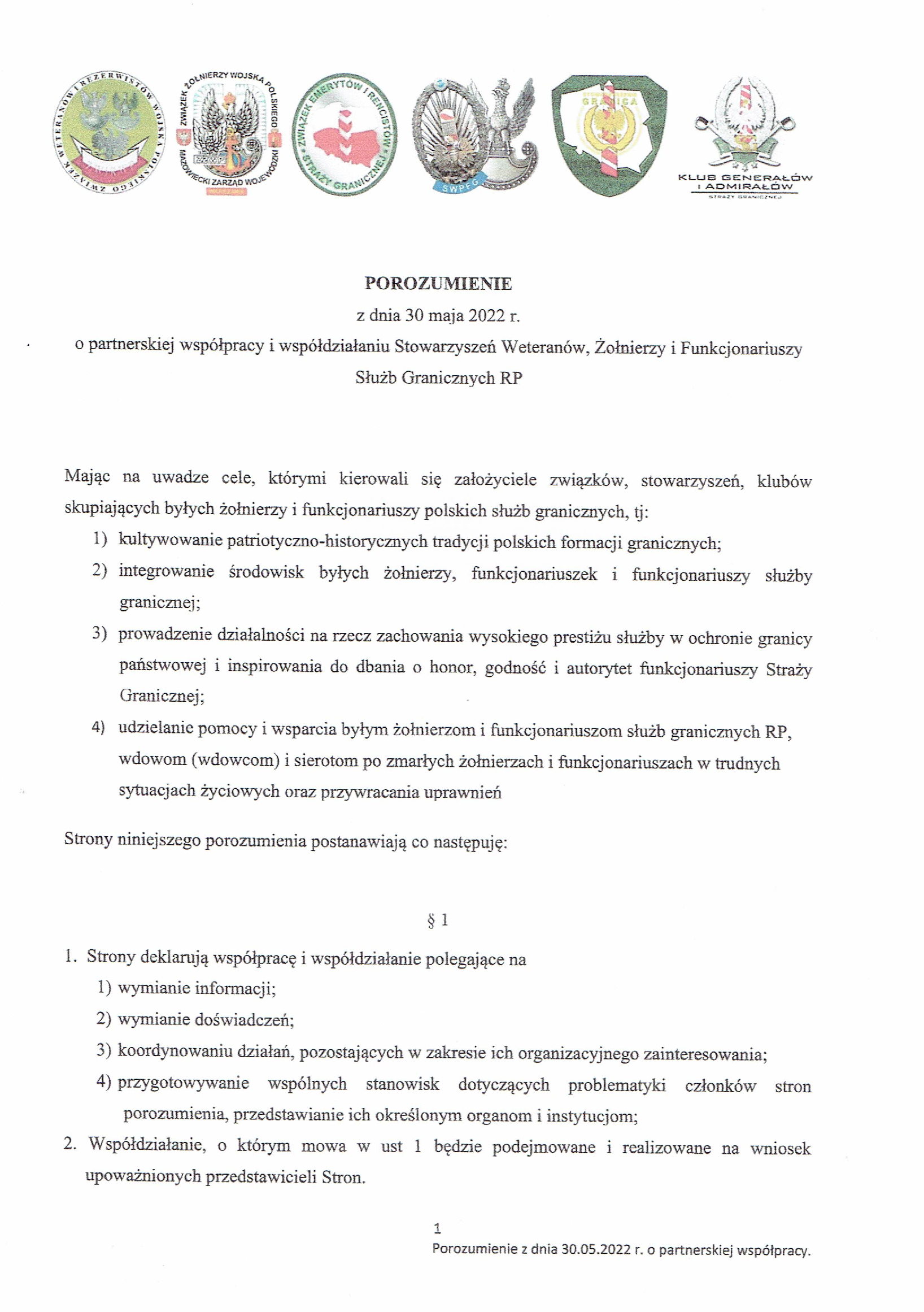 Porozumienie o partnerskiej współpracy i współdziałaniu Stowarzyszeń Weteranów, Żołnierzy i Funkcjonariuszy Służb Granicznych RP.