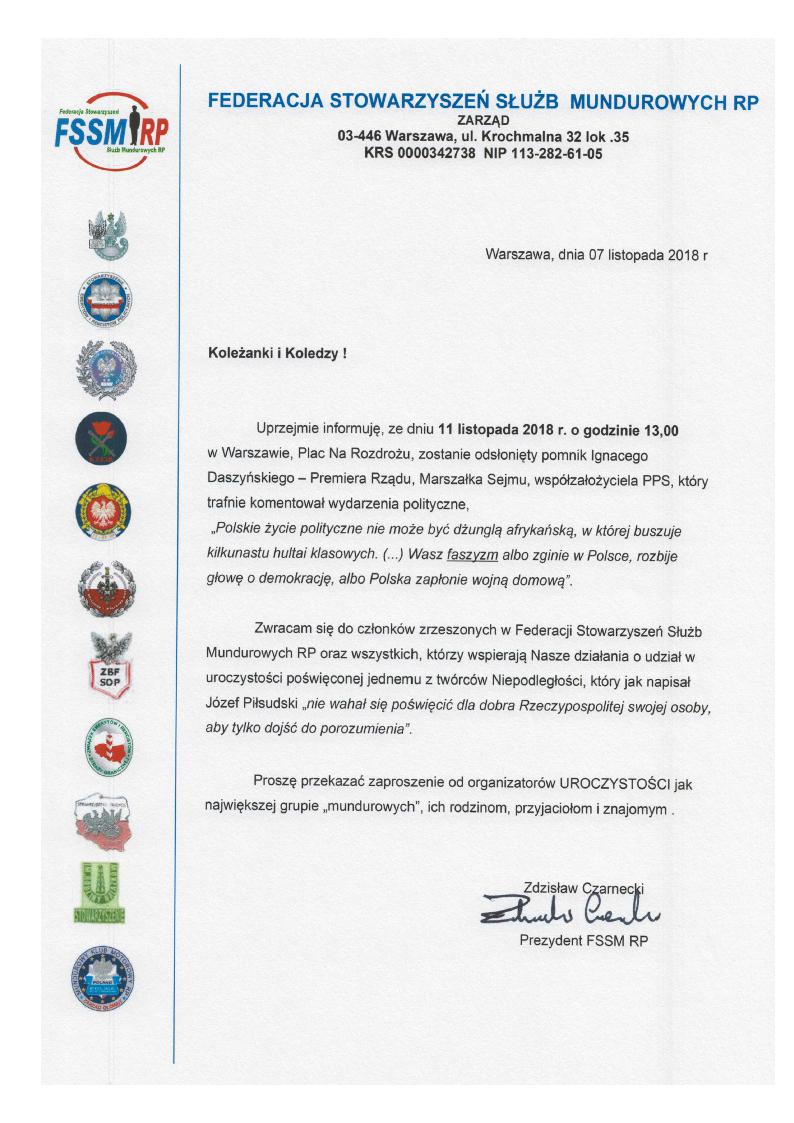 Komunikat Prezydenta FSSM RP o organizacji obchodów 100-lecia Niepodległej w dniu 8 listopada 2018r.