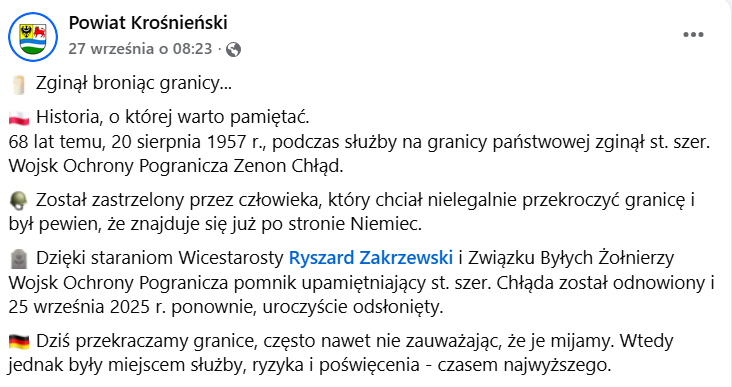 W dniach 25-27 września br. gościliśmy na naszym terenie grupę byłych żołnierzy WOP, stowarzyszonych w ogólnopolskim Związku Byłych Żołnierzy Wojsk Ochrony Pogranicza, której przewodził Prezes Związku kol. Stanisław Matusik. Z inicjatywy tego stowarzyszenia przy wsparciu Starostwa Krośnieńskiego odnowiono i ponownie odsłonięto pomnik poległego w ochronie granicy st szer. WOP Zenona Chłąda. Tutaj skrócone cytaty z wpisu kol. S. Matusika na Facebooku: