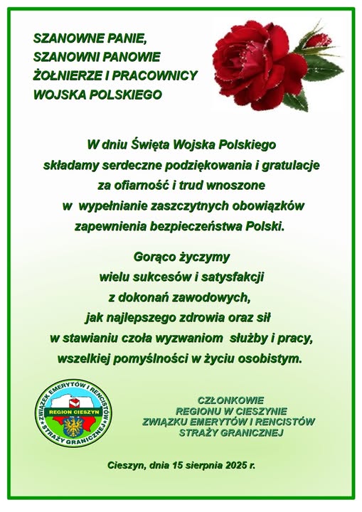 Z okazji Święta Wojska Polskiego życzymy Wam wszystkiego najlepszego, samych sukcesów w służbie i pracy oraz satysfakcji z dobrze spełnionego obowiązku wobec Ojczyzny. Natomiast w życiu prywatnym – pełni szczęścia i miłości, zadowolenia z realizacji własnych pasji! Emerytom i rencistom wojskowym, a także ich rodzinom życzymy dużo zdrowia i samych pogodnych chwil!