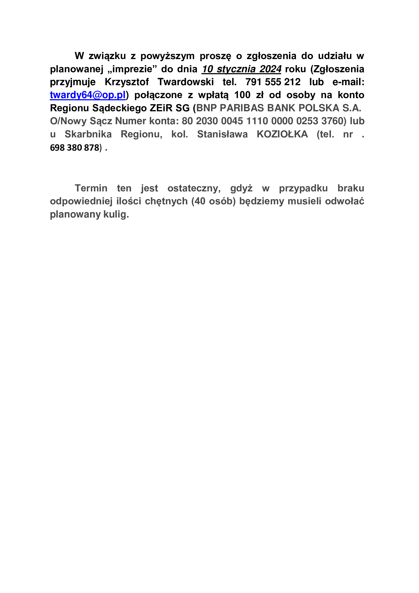 | skarbnik | Stanisław Koziołek | tel. 698 380 878 | stas_u@onet.eu |
